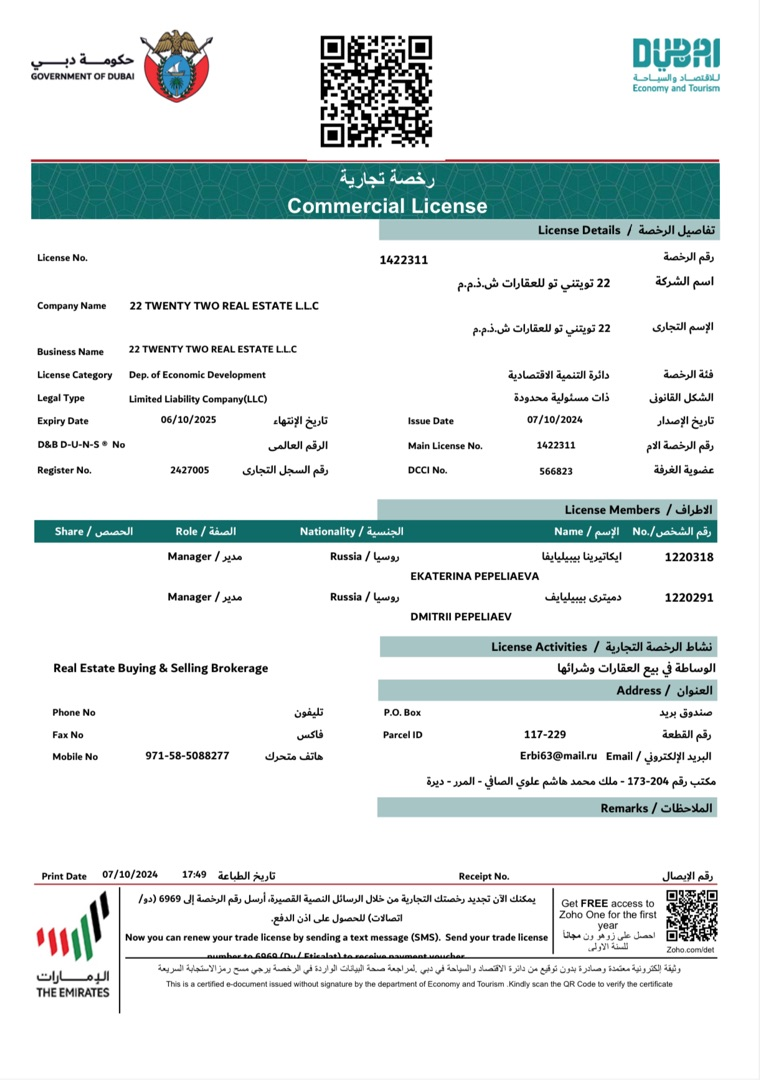 Екатерина Пепеляева — руководитель 22 Twenty Two Real Estate Brokerage Agency. Екатерина создала высокопрофессиональную команду, с более чем 10 летним опытом работы на рынке ОАЭ и выстроила бизнес, ориентированный на достижение максимальных результатов в каждой сделке.